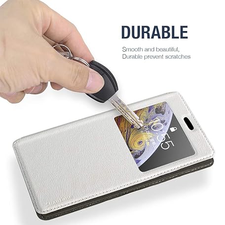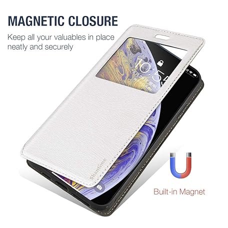 Thông tin sản phẩm Shantime Sichtfenster-Lederhülle Kompatibel mit Kyocera Torque G04 KYV46, Elegantes Design mit Klarsichtanzeige, Unsichtbarem Magnetverschluss und Kartenfach(Weiß)