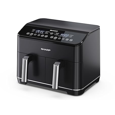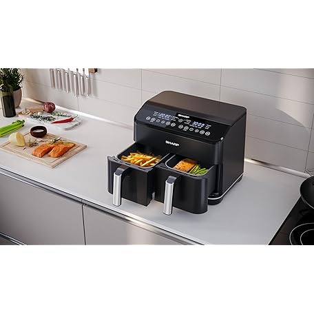 Thông tin sản phẩm SHARP AF-GD82AE-B Hot Air Fryer with 2 Compartments, 2 x 4L with Digital Control - Touch Display Function, 12 Programmes, 1800W, Black, Baking without Oil, W: 39.5 cm x H: 30.5 cm x D: 36.2 cm