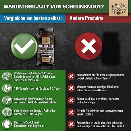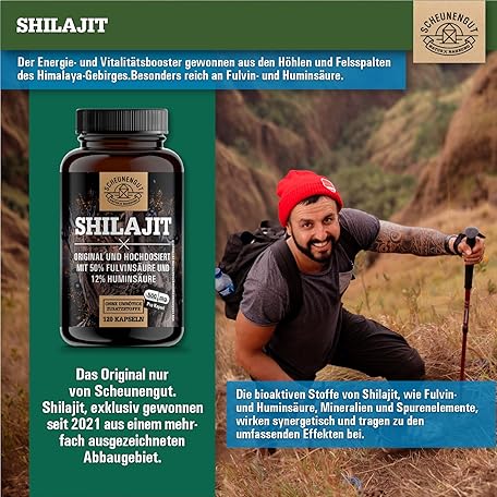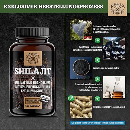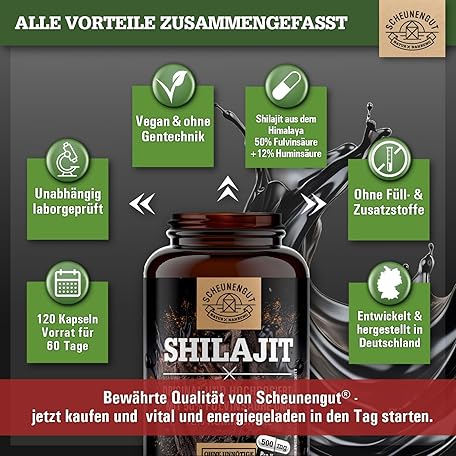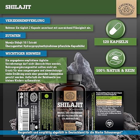 Sản phẩm Shilajit Original Capsules – Important: 1000 mg High Dose per Dose I Pure Mumijo Shilajit from the Himalayas I 50% Fulvic Acid + 12% Humic Acid I Laboratory Tested – DE SCHEUNENGUT® đang được bán với giá ưu đãi là $25.3534 tại nước Đức.