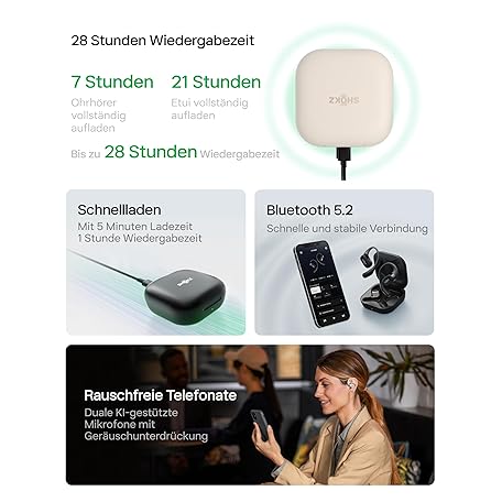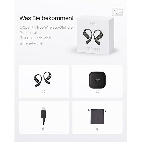 Thông tin sản phẩm SHOKZ OpenFit True Wireless Earbuds, Open-Ear Bluetooth Kabellose Kopfhörer mit Noise-Cancelling Mikrofon, Ohrhörer mit schnellem Aufladen, 28 Std Laufzeit, IP54 Wasserdicht, mit Tragetasche, Schwarz