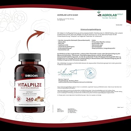 Thương hiệu SHROOMY là cái tên nổi tiếng được rất nhiều khách hàng trên thế giới chọn lựa. Với kiểu dáng đẹp mắt, sang trọng, sản phẩm SHROOMY Mushroom Complex Kapseln mit 6 Vitalpilzen (Hericium, Cordyceps, Chaga, Reishi, Shiitake, Maitake) – 240 Stück – 20% Beta-Glucan – vegan là sự lựa chọn hoàn hảo nếu bạn đang tìm mua một món cho riêng mình.
