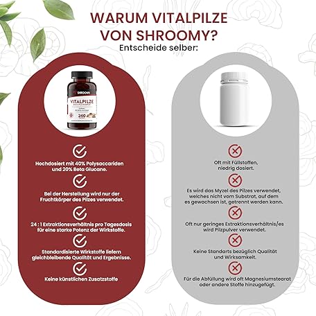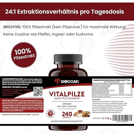 Thông tin sản phẩm SHROOMY Mushroom Complex Kapseln mit 6 Vitalpilzen (Hericium, Cordyceps, Chaga, Reishi, Shiitake, Maitake) – 240 Stück – 20% Beta-Glucan – vegan