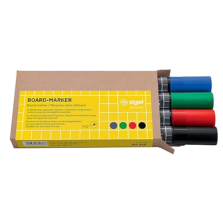 SIGEL BA010 Board-Marker - trocken und feucht abwischbar - schwarz, blau, rot, grün - Rundspitze 2-3 mm - 4 Stück - für weiße Glas-Magnettafeln, Whiteboards und Flipcharts