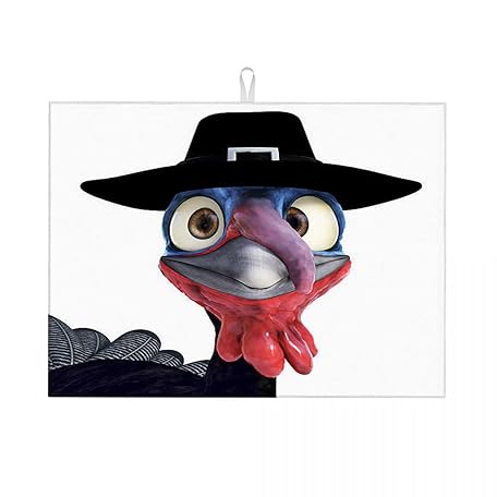 Silly Toon Turkey with Pilgrim Hat Picture Dish Mat Drying Mat Kitchen Mat Kitchen Counter Mat Machine Washable Small 16x18 Inch