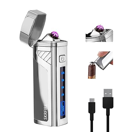 SKRFIRE Electric Lighter with Three Arc, Flameless Plasma Lighter, Windproof Rechargeable USB Lighter for Outdoor Camping with Digital Battery Indicator (Silver)