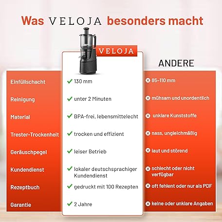Thương hiệu VELOJA là cái tên nổi tiếng được rất nhiều khách hàng trên thế giới chọn lựa. Với kiểu dáng đẹp mắt, sang trọng, sản phẩm Slow Juicer Pro - Cold Press Juicer for Whole Fruits & Vegetables with 130 mm XL Filling Chute - Ultra Quiet Motor - Easy to Clean - Includes Recipe Book for Juices & Pomace Recipes là sự lựa chọn hoàn hảo nếu bạn đang tìm mua một món cho riêng mình.