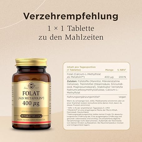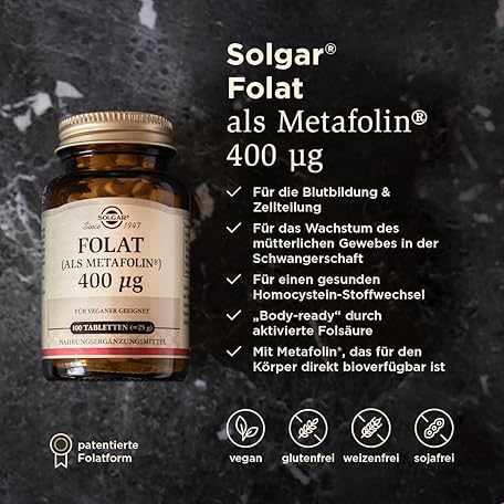 Sản phẩm SOLGAR® Folate (as Metafolin®) 400 mcg, also known as vitamin B9 | for desire to have children, pregnancy and breastfeeding and vegan diet | 100 vegan tablets đang được bán với giá ưu đãi là $29.0485 tại nước Đức.