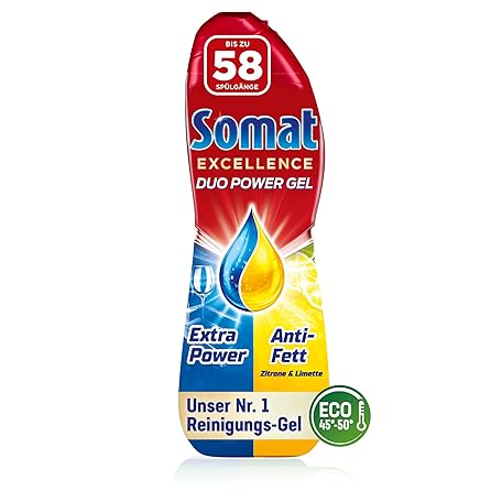 Somat Excellence Duo Power Gel (58 Washes) Dishwasher Detergent for Radiantly Clean Dishes, Also in the Eco Program & at Low Temperatures, Lemon & Lime