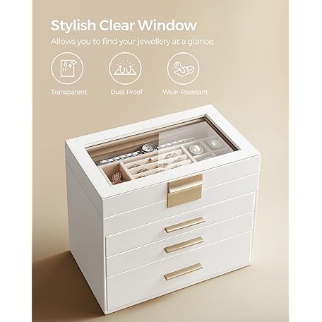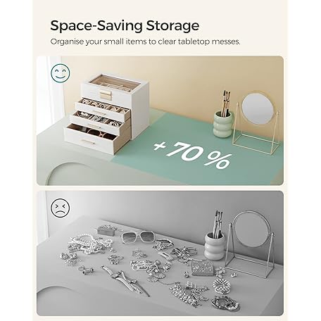 Thông tin sản phẩm SONGMICS JBC161W01 4-Tier Jewellery Storage Box with Glass Lid, 3 Drawers, Modern, for Sunglasses, Large, Modern Cloud White, Golden