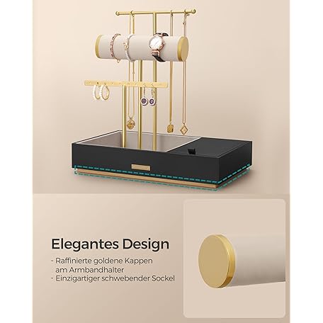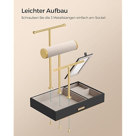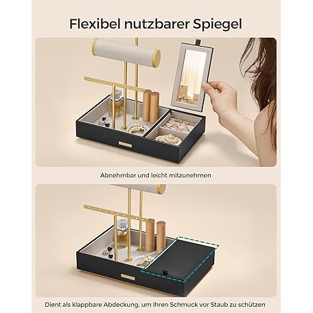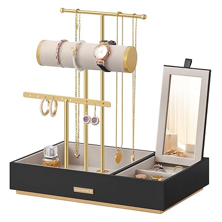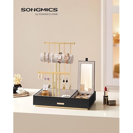 Thông tin sản phẩm SONGMICS JJS022B01 Jewellery Stand, Earring Holder, Metal Jewellery Tray with Mirror, Jewellery Storage for Necklaces, Bracelets, Earrings, Rings, Gift Idea, Gold/Black
