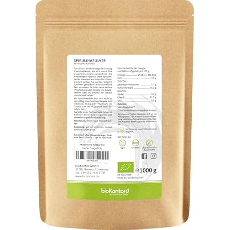 Sản phẩm Spirulina Pulver BIO 1000 g (1 kg) I 100% natürlich und rein - aus kontrolliert biologischem Anbau I ohne Zusatzstoffe I von bioKontor đang được bán với giá ưu đãi là $30.1385 tại nước Đức.