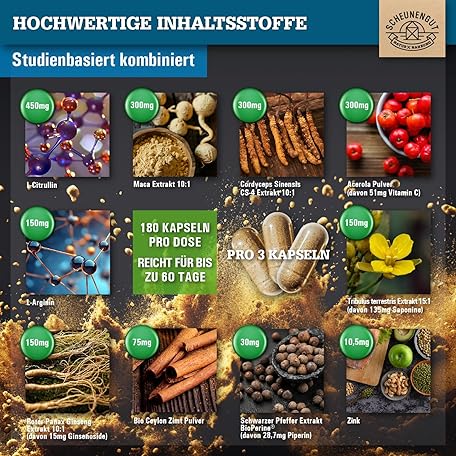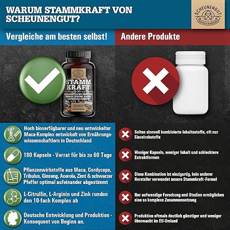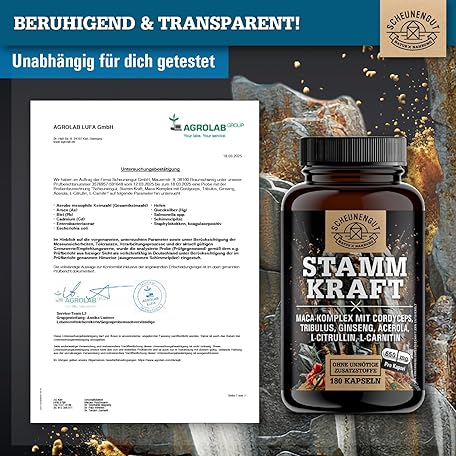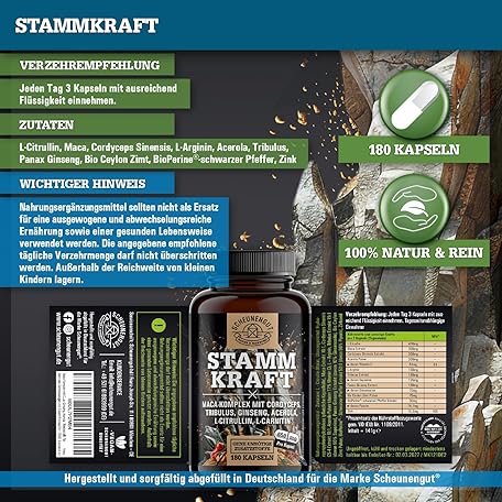 Sản phẩm STAMMKRAFT® Maca Capsules High Dose – Important: Study Based Combined with Cordyceps, Tribulus Terrestris, Panax Ginseng, L-Carnitine & L-Citrulline – 180 Capsules – DE SCHEUNENGUT® đang được bán với giá ưu đãi là $25.3861 tại nước Đức.