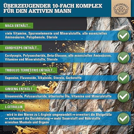 Thông tin sản phẩm STAMMKRAFT® Maca Capsules High Dose – Important: Study Based Combined with Cordyceps, Tribulus Terrestris, Panax Ginseng, L-Carnitine & L-Citrulline – 180 Capsules – DE SCHEUNENGUT®