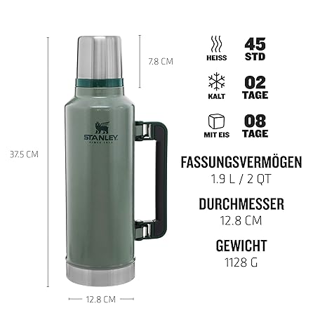 Thương hiệu STANLEY là cái tên nổi tiếng được rất nhiều khách hàng trên thế giới chọn lựa. Với kiểu dáng đẹp mắt, sang trọng, sản phẩm Stanley Classic Legendary Thermos Bottle, 1.9 L, Keeps Hot or Cold for 45 Hours, Stainless Steel Thermos Flask, BPA-Free, Dishwasher Safe, Hammertone Green là sự lựa chọn hoàn hảo nếu bạn đang tìm mua một món cho riêng mình.