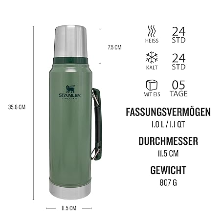 Thông tin sản phẩm Stanley Classic Legendary Thermos Flask, 1 L, Thermos Keeps Hot or Cold for 24 Hours, Stainless Steel Thermos Flask, BPA-Free, Dishwasher Safe, Hammertone Green