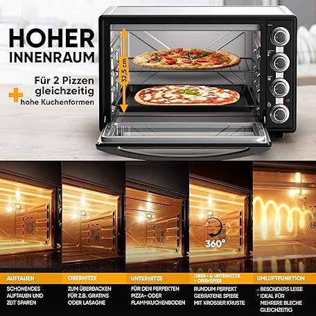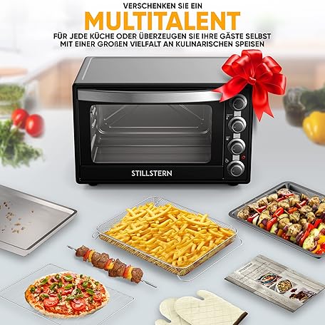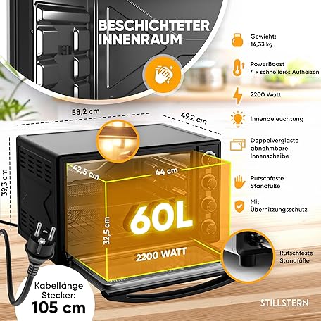 Thông tin sản phẩm Stillstern CYCLONE PRO+ Mini Oven with Convection 60 L (German Version) Pizza Diameter 40, Non-Stick Coating, Defrosting, 2-Hour Timer, Camping Mini Oven Convection Pizza Oven, Mini Oven, Small