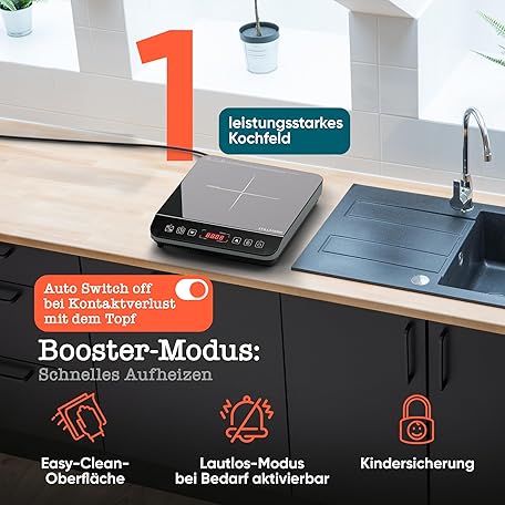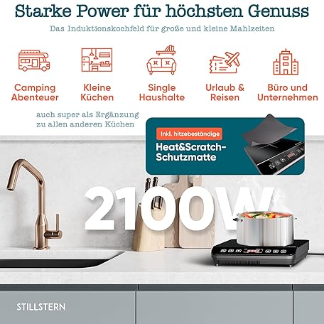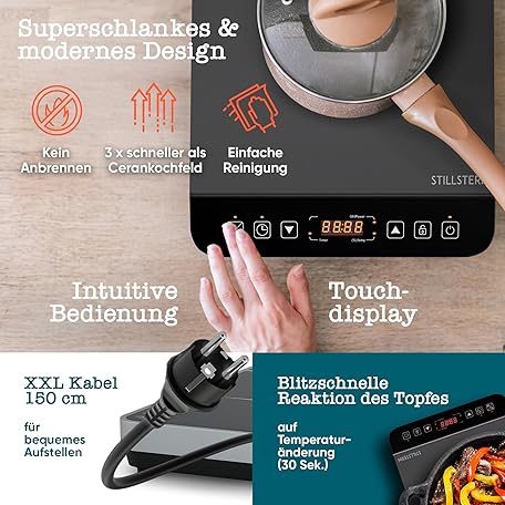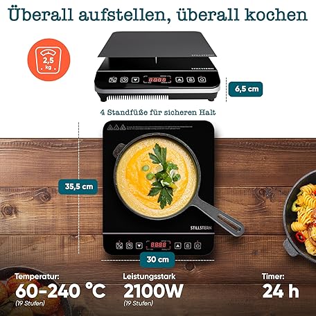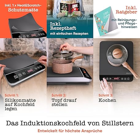 Thông tin sản phẩm Stillstern Induction Hob 2100 W Black/Silver, Induction Hob 12-28 cm, Booster Mode, Cooking Mat Heat Resistant, Quiet Function, 19 Levels, 24 Hours Timer, Touch