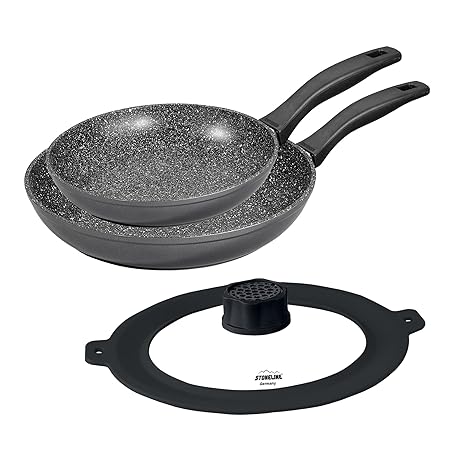 STONELINE Aluguss Pfannenset 3 teilig, 24/28 cm, Antihaft Pfanne mit Deckel kleinste Dunstabzugshaube, beschichtet mit echten Steinpartikeln, für alle Herdarten Induktion Backofen, Fett frei Braten