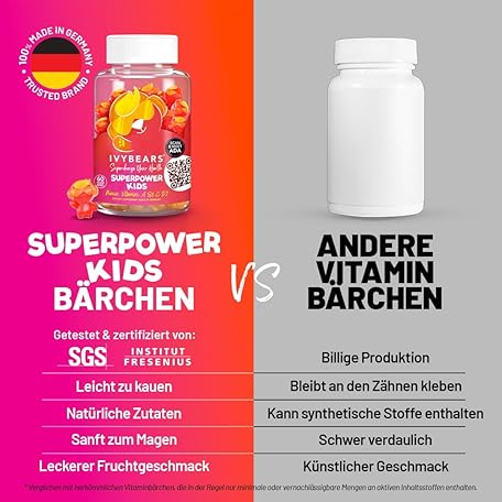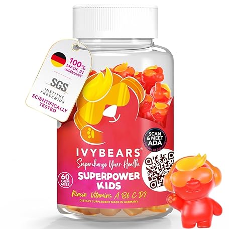 Sản phẩm Superpower Children's Immune System Strengthening Vitamin A, B6, C, D & E Multivitamin Gummy Bears for Children 100% Natural Berry Flavour Made in Germany Daily Supply 60 Pieces IVYBEARS® đang được bán với giá ưu đãi là $24.0127 tại nước Đức.