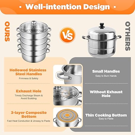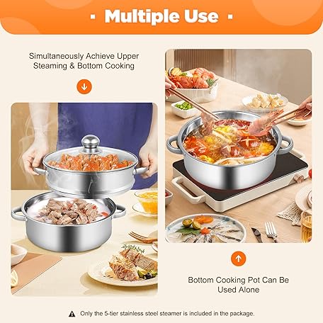 Thông tin sản phẩm Susoso 26 cm Steamer, 5-Layer Stainless Steel Steamer Cooking Pot Warming Function with Glass Lid for All Hob Types, Silver