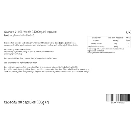 Thông tin sản phẩm Swanson, C-1000 Vitamin C with Rose Hips, 90 Gluten-Free Capsules, 1000 mg Vitamin C per Dose, Soy Free, GMO Free, Neutral in Taste
