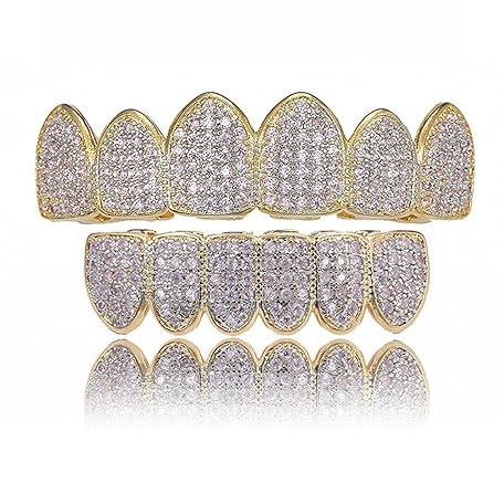 • SXQCKJ Regenbogenfarbene Grillz-Zähne, 18 Karat Vergoldete Ober- und Unterkappen, mit Strass Besetzte Eckzähne, Set für Damen Herren(Pink)