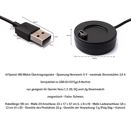 Sản phẩm SYSTEM-S USB 2.0 Cable 100 cm Charging Cable for Garmin Venu 1 2 2S SQ Lily Smartwatch Black đang được bán với giá ưu đãi là $13.6577 tại nước Đức.