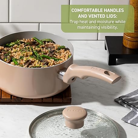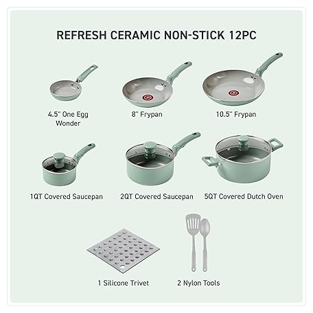Thông tin sản phẩm T-fal Refresh Ceramic Non-Stick Cookware Set, 12 Pieces, Oven Safe, 12 Piece Cookware, Kitchen Cooking Set with Frying Pans, Pots and Kitchen Utensils, Pots and Pans, Non-Stick
