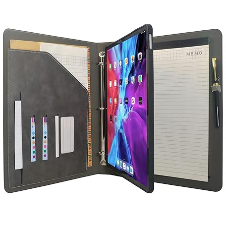 Tablet-Organizer, Portfolio-Hülle mit 3-Ringbuch, Ordner, Padfolio-Aktenordner mit abnehmbarer Tablet-Halterung, kompatibel mit 12,9 Zoll iPad Pro 4. / 5. / 6. Generation, Grau