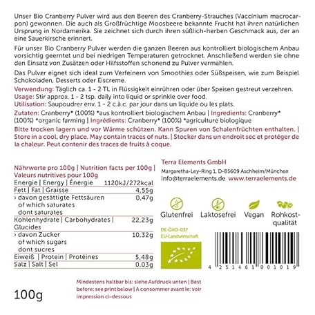 Thông tin sản phẩm Terra Elements Organic Cranberry Powder, 100 g, 100% Pure, Vegan, Raw Food