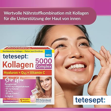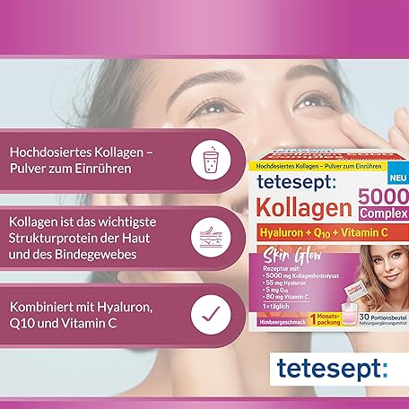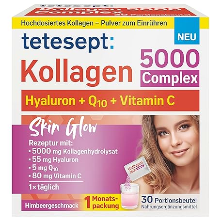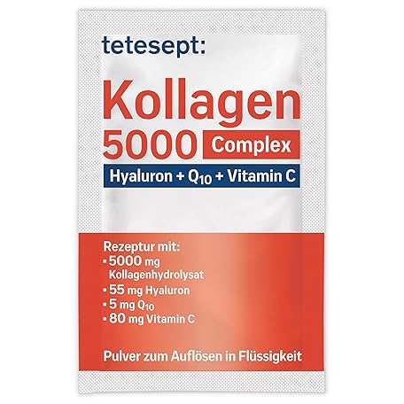 Sản phẩm tetesept Collagen 5000 Complex High-Quality Beauty Collagen Complex with Collagen Hydrolysate, Hyaluronic Acid, Q10 & Vitamin C - for Beautiful, Radiant Skin - 1 x 30 Portion Bags đang được bán với giá ưu đãi là $29.3428 tại nước Đức.