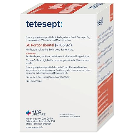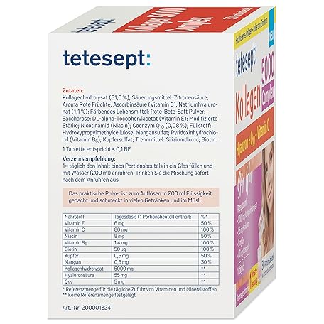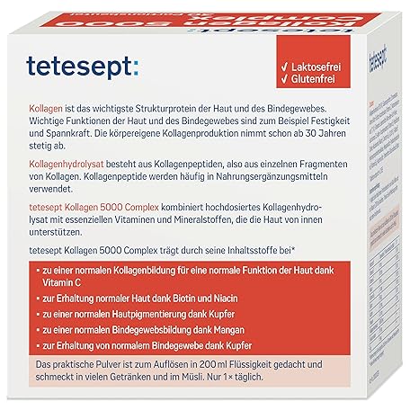 Thông tin sản phẩm tetesept Collagen 5000 Complex High-Quality Beauty Collagen Complex with Collagen Hydrolysate, Hyaluronic Acid, Q10 & Vitamin C - for Beautiful, Radiant Skin - 1 x 30 Portion Bags