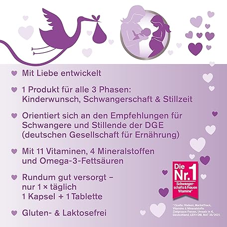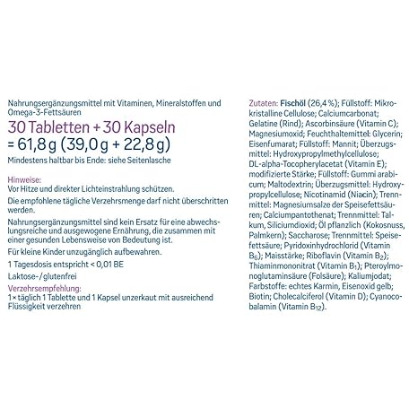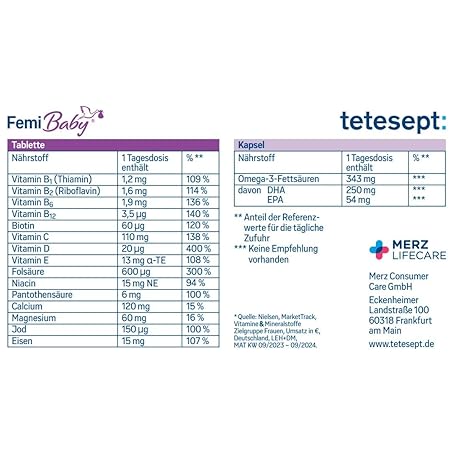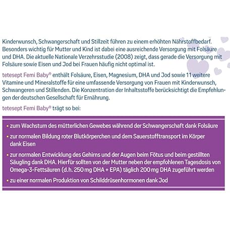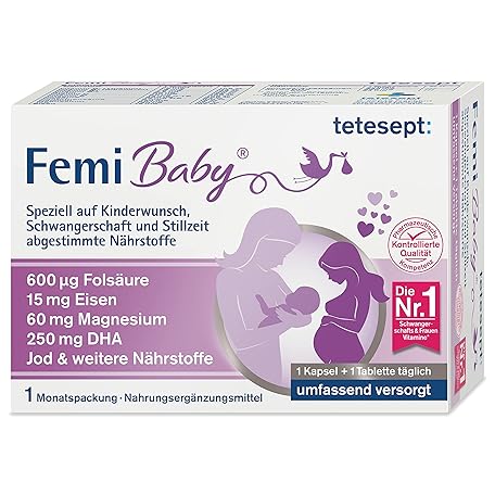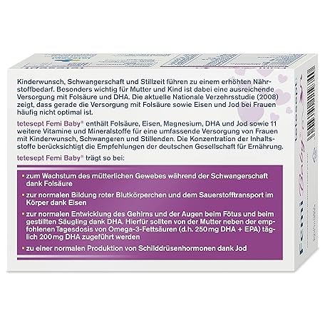 Thông tin sản phẩm tetesept Femi Baby, 16 nutrients for Mothers wo Want Children, Pregnancy and Breastfeeding, folic acid, iron, iodine plus DHA, 1 x monthly pack of 30 tablets, 30 capsules.