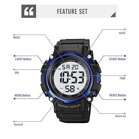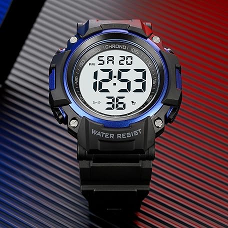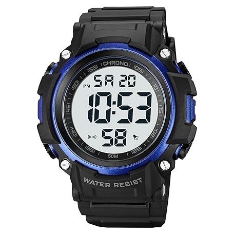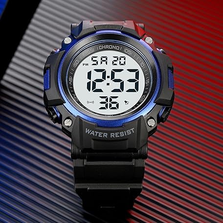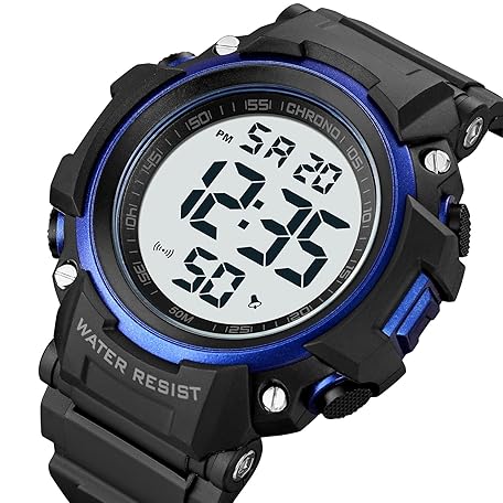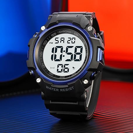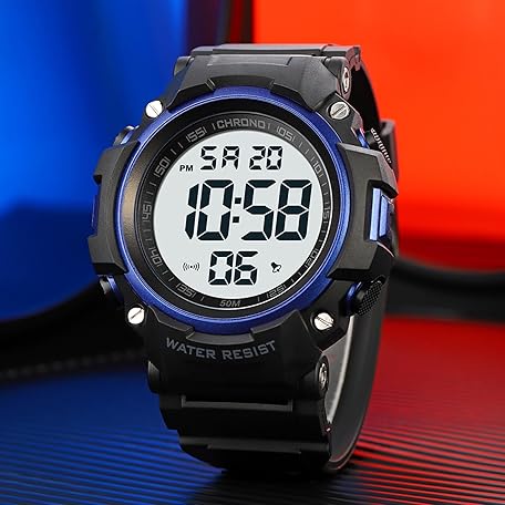 Thông tin sản phẩm Tevimpeya Men's Sports Digital Watches, 50 m Waterproof Sports Outdoor Digital Watch, Black Big Face Watch with Alarm Clock, Calendar, Stopwatch, EL Backlight, Blue White, black, Modern