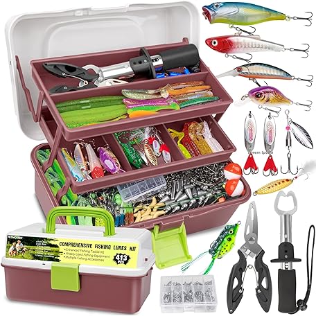 THKFISH 3-lagige Angelbox mit Angelzubehör, 413-teiliges Angelköderzubehör und Werkzeug-Set enthält Kurbelköder, Haken, Gewichte, Senker, Barsch, Angelzange, Ausrüstung, Geschenk für Männer