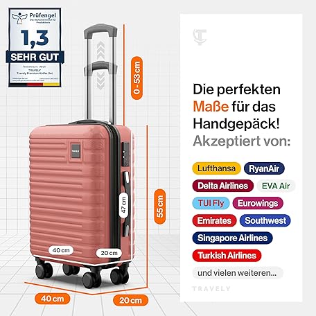 Sản phẩm Travely Premium Handgepäck Koffer 55x40x20cm - passend für Ryanair, Lufthansa, Eurowings und co. I 36L Handgepäck Koffer mit sanften Rollen und praktischem TSA Schloss, Reisekoffer đang được bán với giá ưu đãi là $86.1427 tại nước Đức.