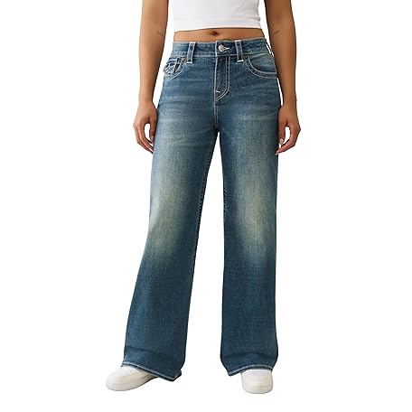 True Religion Bobbi Women's Baggy Jeans Wide Leg Distressed Hem Denim Flap Pockets