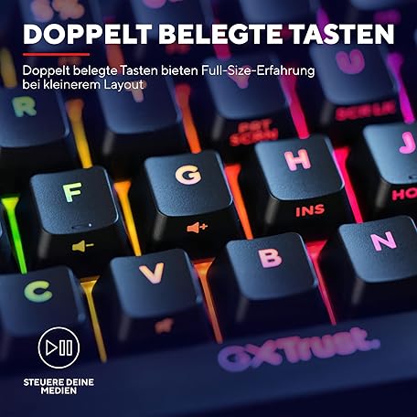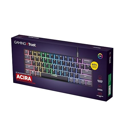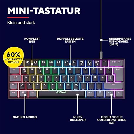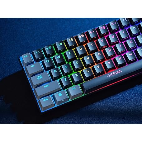 Thông tin sản phẩm Trust Gaming GXT 867 Acira 60% Mechanische Tastatur Deutsches QWERTZ Layout, RGB Beleuchtung, Doppelt Belegte Tasten, USB Mini Tragbare Programmierbare Kleine Gaming Tastatur 60 Prozent PC Laptop