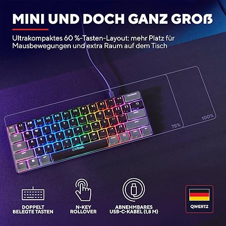 Sản phẩm Trust Gaming GXT 867 Acira 60% Mechanische Tastatur Deutsches QWERTZ Layout, RGB Beleuchtung, Doppelt Belegte Tasten, USB Mini Tragbare Programmierbare Kleine Gaming Tastatur 60 Prozent PC Laptop đang được bán với giá ưu đãi là $51.8295 tại nước Đức.