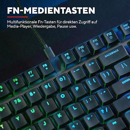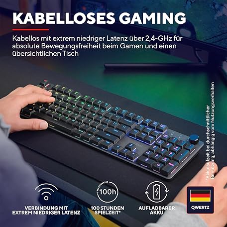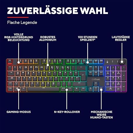 Sản phẩm Trust GXT 868 Torix Mechanical Keyboard Wireless German QWERTZ Layout, RGB Rechargeable Gaming Keyboard 2.4 GHz 100H Battery Life, Huano Switches Flat Keys, Programmable, PC Laptop đang được bán với giá ưu đãi là $84.1153 tại nước Đức.