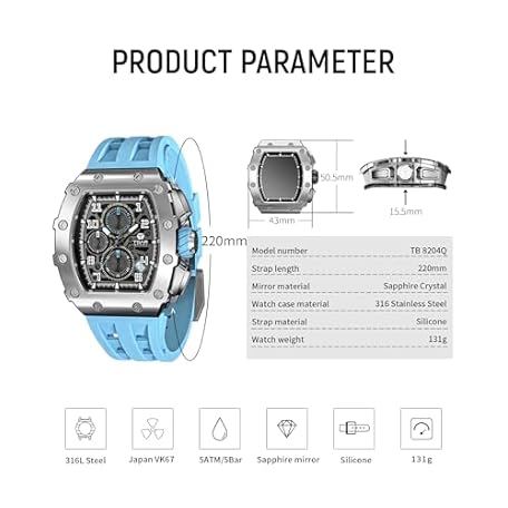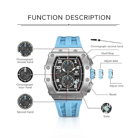 Thông tin sản phẩm TSAR BOMBA Men's Watch, Square, Analogue, 50 m Waterproof, Tonneau Chronograph, Unique Sports Watch, Diver’s Watch, Quartz, Stylish Design, Night Watch with Rubber Strap