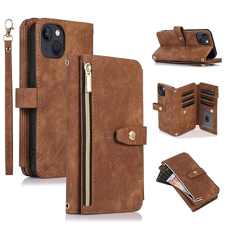 UEEBAI Case for iPhone 13/iPhone 14 6.1’’, 9 Card Slots, Retro Leather Wallet, Shockproof Flip Case with Hand Strap, Stand Function, Zip Case, Magnetic Closure Wallet, Retro Brown
