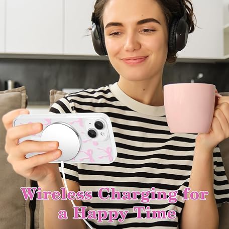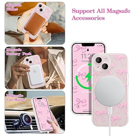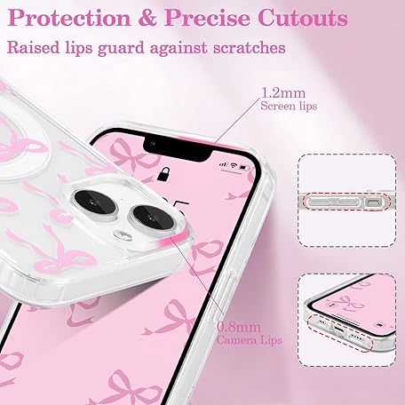 Thông tin sản phẩm UEEBAI Magnetic Case for iPhone 13/iPhone 14, Cute, Silicone, Tansparent, with Bow Pattern, Protective, Supports Wireless Charging, Soft Bumper Case for Women, Girls, Pink