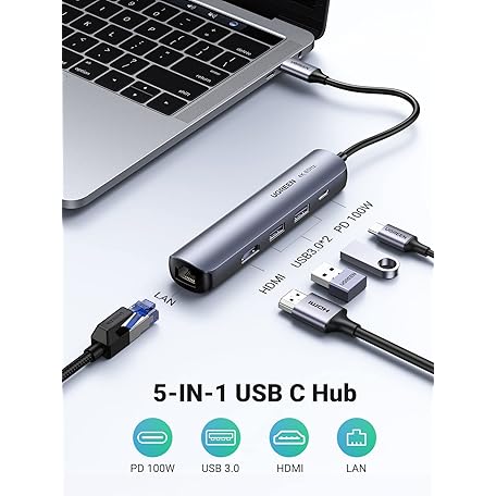 Thông tin sản phẩm UGREEN USB C Hub Ethernet HDMI USB C Dock with 100W PD, 4K HDMI, Ethernet, 2 USB 3.0, USB C Adapter Compatible with iPhone 15, Surface Pro, MacBook Pro/Air, iPad Pro/Air, Galaxy Tab, Galaxy S24 etc.