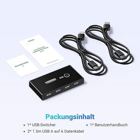 Thông tin sản phẩm UGREEN USB Switch 2PC KVM USB Switch 2 in 4 Out for Stable Data Transfer Switch with 2 USB Cables for Keyboard, Mouse, Printer, Scanner, USB Sticks, External Hard Drive, Headsets etc.