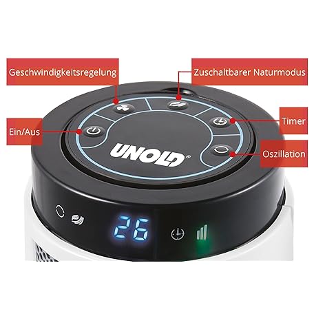 Thông tin sản phẩm Unold 86940 Tower Fan Sight - 3-Level Speed Control, Switchable 70° Oscillation, Remote Control, LED Display, Timer Function, Cable Storage