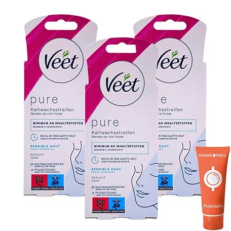 Veet PURE Kaltwachsstreifen Gesicht 3x 20 Stk. I Für sensible Haut I Sanfte & effektive Haarentfernung I Bis zu 28 Tage glatte Haut I Ohne Reiben & Erhitzen I Spar-Set plus Pharma Perle give-away