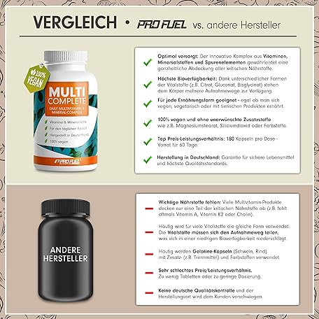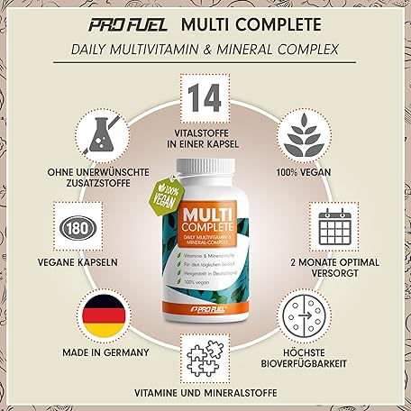 Thương hiệu ProFuel là cái tên nổi tiếng được rất nhiều khách hàng trên thế giới chọn lựa. Với kiểu dáng đẹp mắt, sang trọng, sản phẩm Vegane Vitamine & Mineralstoffe - 180 Kapseln - MULTI COMPLETE Multivitamin & Mineral-Komplex vegan: Vitamin A, B2, B12, D3, K2, Folsäure, Calcium, Magnesium, Zink, Eisen, Selen, Jod - 2 Monats-Vorrat là sự lựa chọn hoàn hảo nếu bạn đang tìm mua một món cho riêng mình.