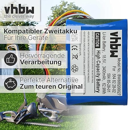 Thương hiệu vhbw là cái tên nổi tiếng được rất nhiều khách hàng trên thế giới chọn lựa. Với kiểu dáng đẹp mắt, sang trọng, sản phẩm vhbw Battery Compatible with Husqvarna Automower 310, Husqvarna Automower 315 Robotic Lawnmower, Replacement Battery (3400 mAh, 18.5 V, Li-Ion) là sự lựa chọn hoàn hảo nếu bạn đang tìm mua một món cho riêng mình.