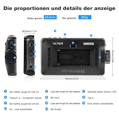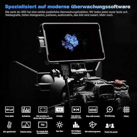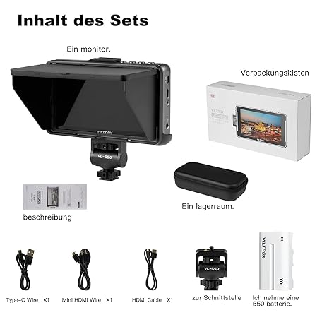 Sản phẩm VILTROX DC-550 Camera Field Monitor 1200Nit 5.5 Inch 4K HDMI Camera Monitor with Battery, Full HD 1920 x 1080 IPS, 5.5 Inch 3D LUT with Sun Protection Cover, Storage Bag for Sony Canon Nikon DSLR đang được bán với giá ưu đãi là $249.4247 tại nước Đức.